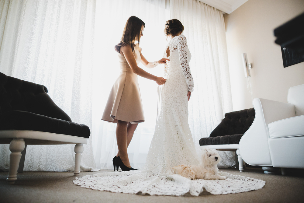 - Bride and bridesmaids getting dressed, applying makeup